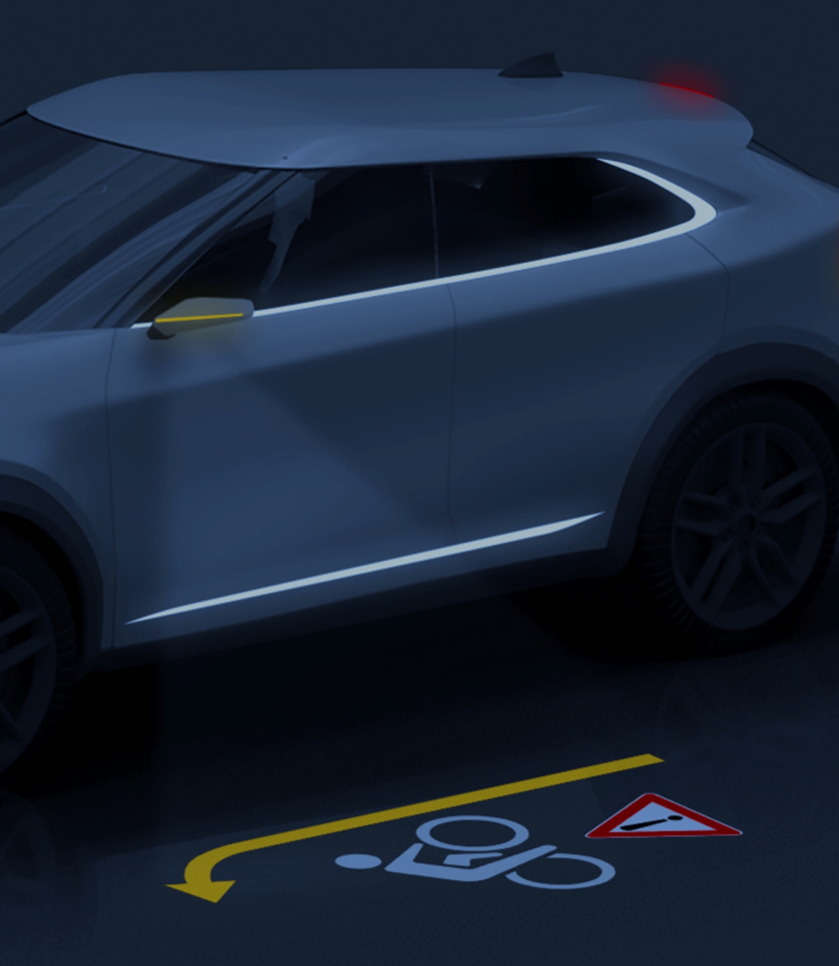 Marelli’s Near-Field Ground Projection technology is a revolutionary advancement in vehicle safety and smart interaction. This system projects dynamic, color-coded symbols onto the ground around the vehicle, providing a 360-degree lighting effect that significantly enhances safety. The projections include real-time alerts such as vehicle turning, reversing, or emergency braking, improving awareness for pedestrians and surrounding vehicles.